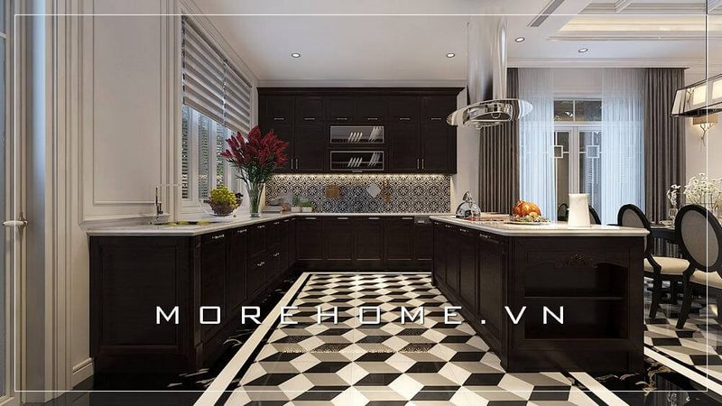 Thiết kế tủ bếp chữ L tân cổ điển với chất liệu gỗ tự nhiên phun sơn trắng lại mang đến cho các thành viên trong gia đình có cảm thấy thân thiết và gần gũi nhau hơn.