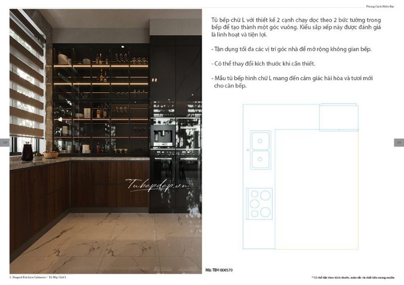 Mẫu tủ bếp gỗ công nghiệp veneer màu nâu chữ L hiện đại là điểm nhấn cho không gian bếp