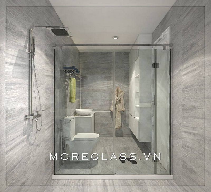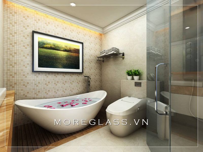 Vách tắm kính 180 độ ngăn giữa 2 không gian ướt và khô tránh văng nước gây ướt át khó chịu.