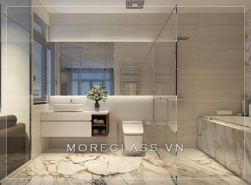 Cuốn hút trước vẻ đẹp sang trọng, hiện đại của mẫu phòng tắm kính đẹp kết hợp gạch ốp tường màu sáng trắng.