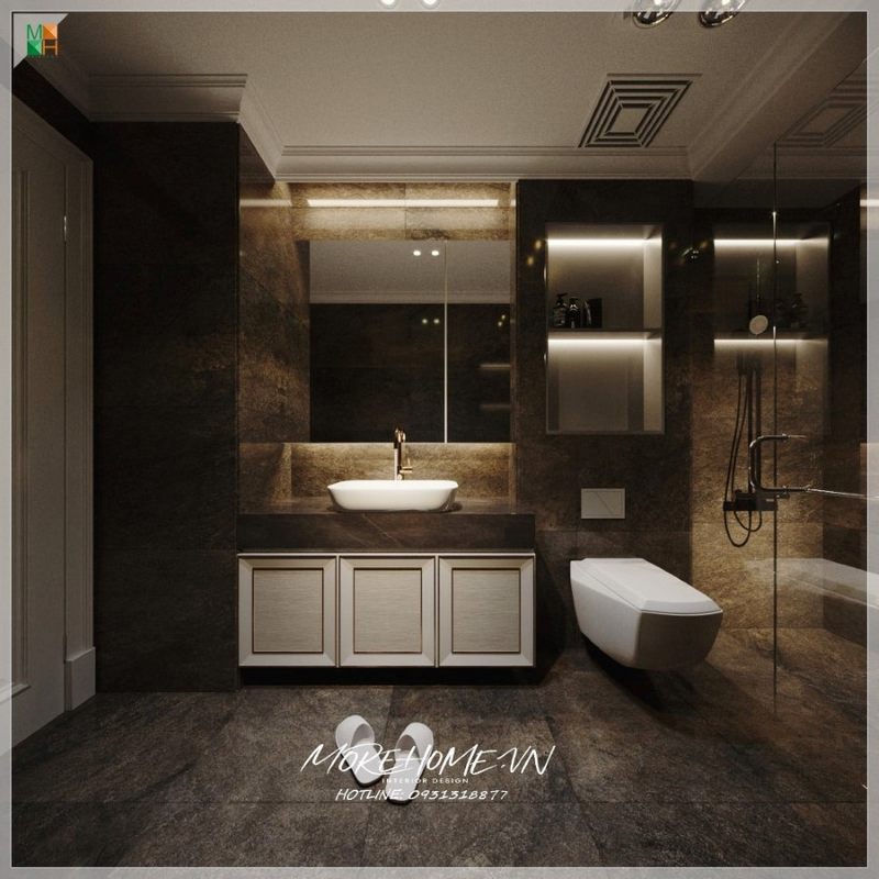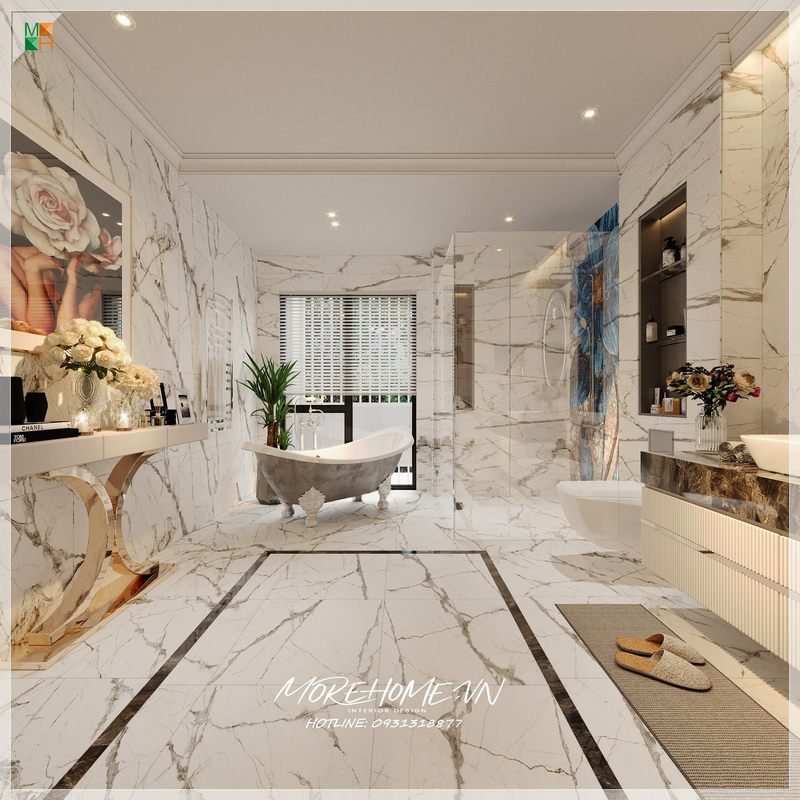 Mẫu thiết kế phòng tắm có bồn tắm nằm cao cấp với thiết bị vệ sinh hiện đại mang đến không gian thư giãn tuyệt vời.