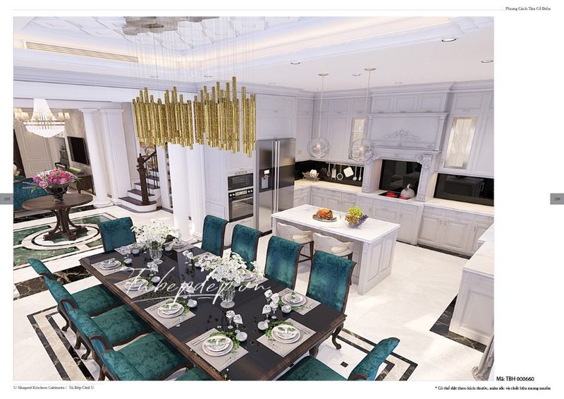 Thiết kế phòng bếp màu trắng tân cổ điển thông với phòng ăn tiện lợi, nổi bật với điểm nhấn bộ bàn gỗ óc chó 10 ghế bọc đệm xanh độc lạ dành cho biệt thự, nhà phố