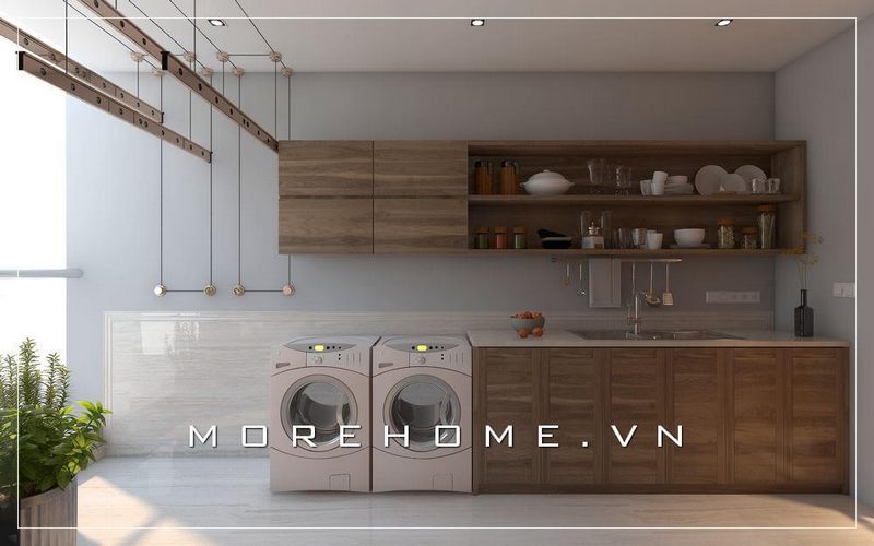 Thiết kế không gian phòng bếp nhà phố hiện đại với nội thất bếp gỗ công nghiệp đơn giản, tiện nghi cho người nội trợ