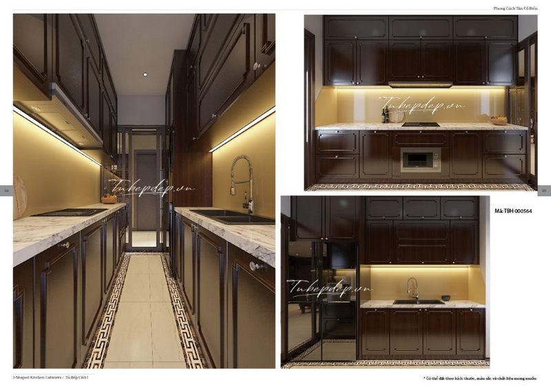 Cách thiết kế nội thất phòng bếp tân cổ điển kiểu song đôi đối diện bếp với bồn rửa sáng tạo được bố trí tủ bếp gỗ tự nhiên sơn bóng sang trọng.