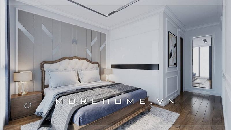 Trang trí nội thất phòng ngủ đẹp với giường gỗ óc chó kiểu dáng tân cổ điển, đầu giường bọc da